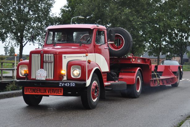 Op bovenstaande foto is de truck gekoppeld aan een uit 1964 daterende Nooteboom kuipdieplader Typt ODU. De dieplader wordt momenteel gerestaureerd.